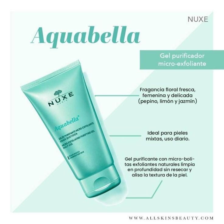 Afin d’aider les peaux mixtes à retrouver leur harmonie et leur fraîcheur, Nuxe propose la Gelée purifiante micro-exfoliante Aquabella, un nettoyant visage aux micro-billes bleues et à la poudre de silice qui gomment la peau du visage sans l’assécher.